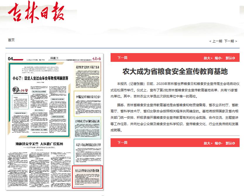 10月27日,吉林日报以《农大成为省粮食安全宣传教育基地》为题,对我校获批吉林省粮食安全宣传教育基地进行了报道。