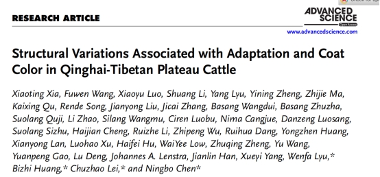 近日,我校副校长,动物科学技术学院、动物医学院吕文发教授团队与西北农林科技大学雷初朝教授等团队,在国际期刊Advanced Science上联合发表题为“Structural Variations Associated with Adaptation and Coat Color in Qinghai-Tibetan Plateau Cattle”的研究论文,这是两校团队深度开展科研协作,继在Nature Communications、Science Bulletin后合作发表的第三项研究成果。