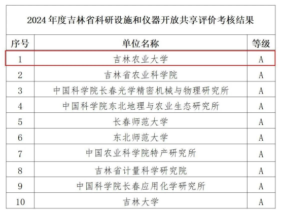 近日,吉林省科技厅发布2024年度吉林省科研设施和仪器开放共享评价考核结果,吉林农业大学再次荣获“A”等次第1名。本次考核结果分A、B、C三个等次,共有10个单位荣获“A”等次。