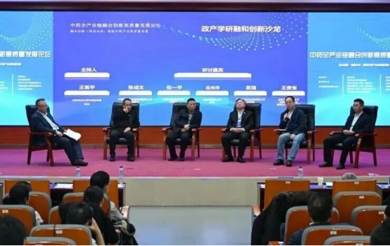 政产学研融合创新沙龙环节,中药材学院院长王英平分别与吉林省科学技术厅医药健康科技处副处长王贵宝、黑龙江创业投资有限公司总经理吴强、成都中医药大学教授吕光华、中国医保商会植物提取物分会理事长张成文、新加坡新南洋集团董事长包一平等五位嘉宾围绕中药全产业链协同发展的关键问题展开深入交流。