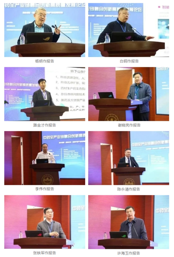 论坛主旨报告环节,江西中医药大学原副校长杨明、南开大学教授白钢、沈阳药科大学副校长路金才、河北省中药材学会理事长谢晓亮、吉林农业大学生命科学院院长李伟、国信医药集团董事长陈永清、天津药物研究院中药首席专家张铁军、辽宁中医药大学副校长许海玉共8位专家围绕中药资源开发、质量评价、新药研发、产业创新等关键议题作深度报告。