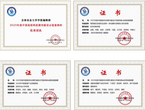 11月6日至9日,中国高校科技期刊研究会第29次年会在陕西省西安市召开,会上发布了“中国高校科技期刊建设示范案例库·金钥/银钥/铜钥视频摘要”遴选结果。学校《吉林农业大学学报》编辑部入选2025年度中国高校科技期刊建设示范案例库·优秀团队案例,期刊中心李艳双、王希入选2025年度中国高校科技期刊建设示范案例库·优秀编辑案例。《经济动物学报》荣获“金钥案例”,《吉林农业大学学报》荣获“铜钥案例”,《菌物研究》荣获“优秀案例”。